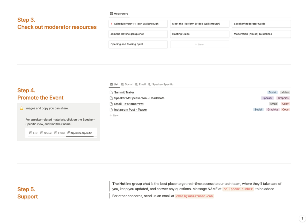 Get the Summit Portal templates we've used during live virtual events. These portals are "one-stop shops" each for your team, speakers, moderators, and partners/sponsors, with everything they need to reference in one place.