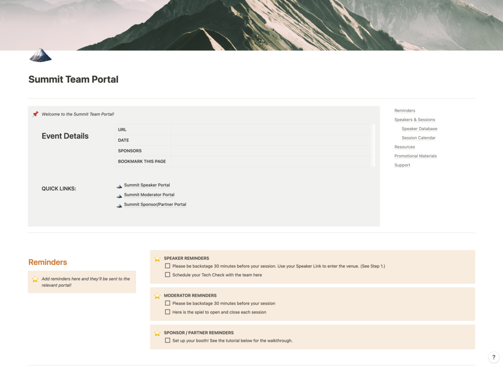 Get the Summit Portal templates we've used during live virtual events. These portals are "one-stop shops" each for your team, speakers, moderators, and partners/sponsors, with everything they need to reference in one place.